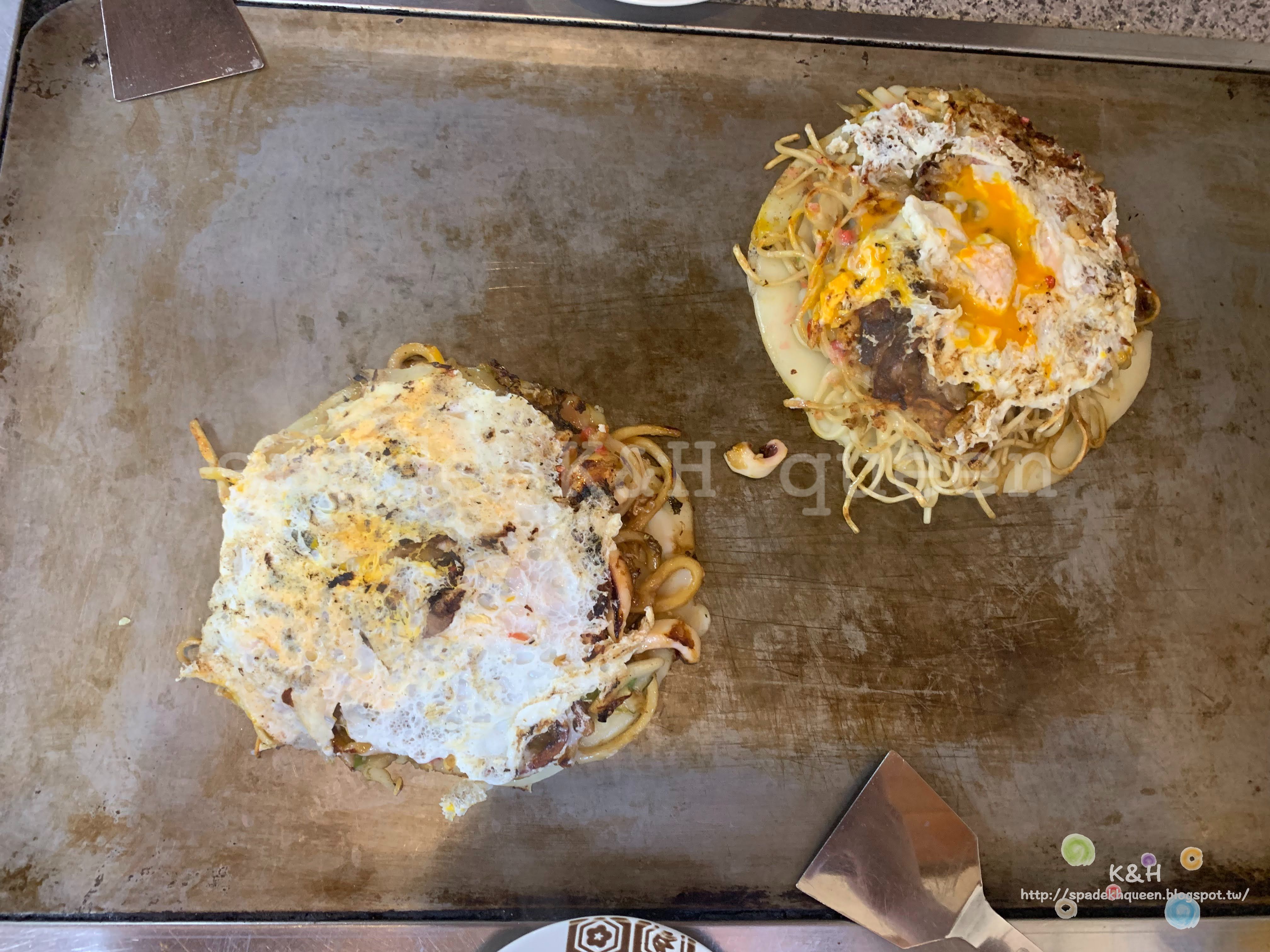 K:整理價格落在千円左右,我們這次點的是「イカ玉、うどう入り(魷魚蛋炒烏龍麵)」、「豚玉、そば入り(豬肉蛋炒麵)」及「生中(生啤酒)」!
